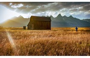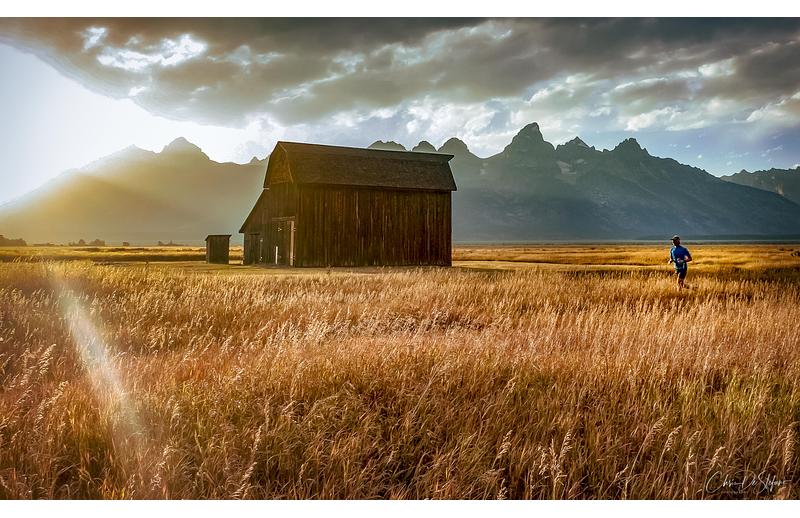 Runner on Mormon Row at sunset